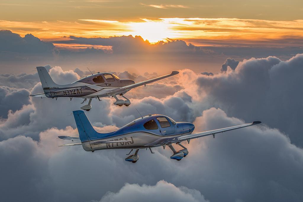 Two Cirrus SR-22 aircraft fly above the clouds at dawn near Miami, Florida in November of 2017.