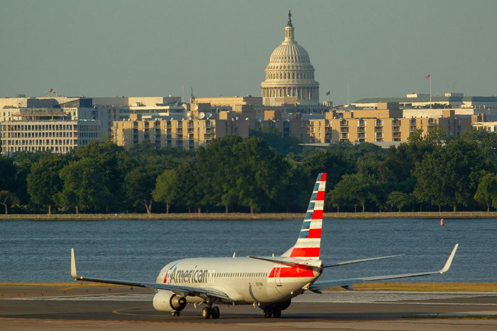 An American Airlines Boeing 737-8 awaits departure from Washington Reagan National Airport with the U.S. Capitol in the background.