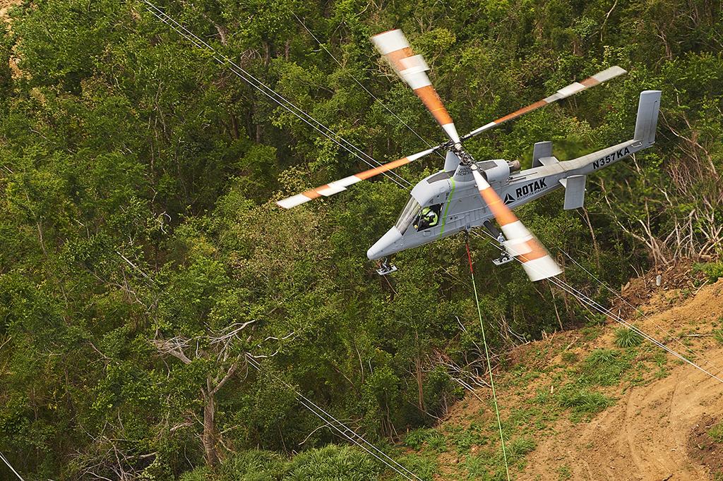 Framed by the dense foliage onto which power lines headed to San Juan, Puerto Rico, had fallen in the fury of Hurricane Maria, this K-MAX operated by Rotak Helicopter Services precisely lowers a high-tension power line tower support. The K-MAX placed supports and towers, hauling the fallen conductors out of the jungle.