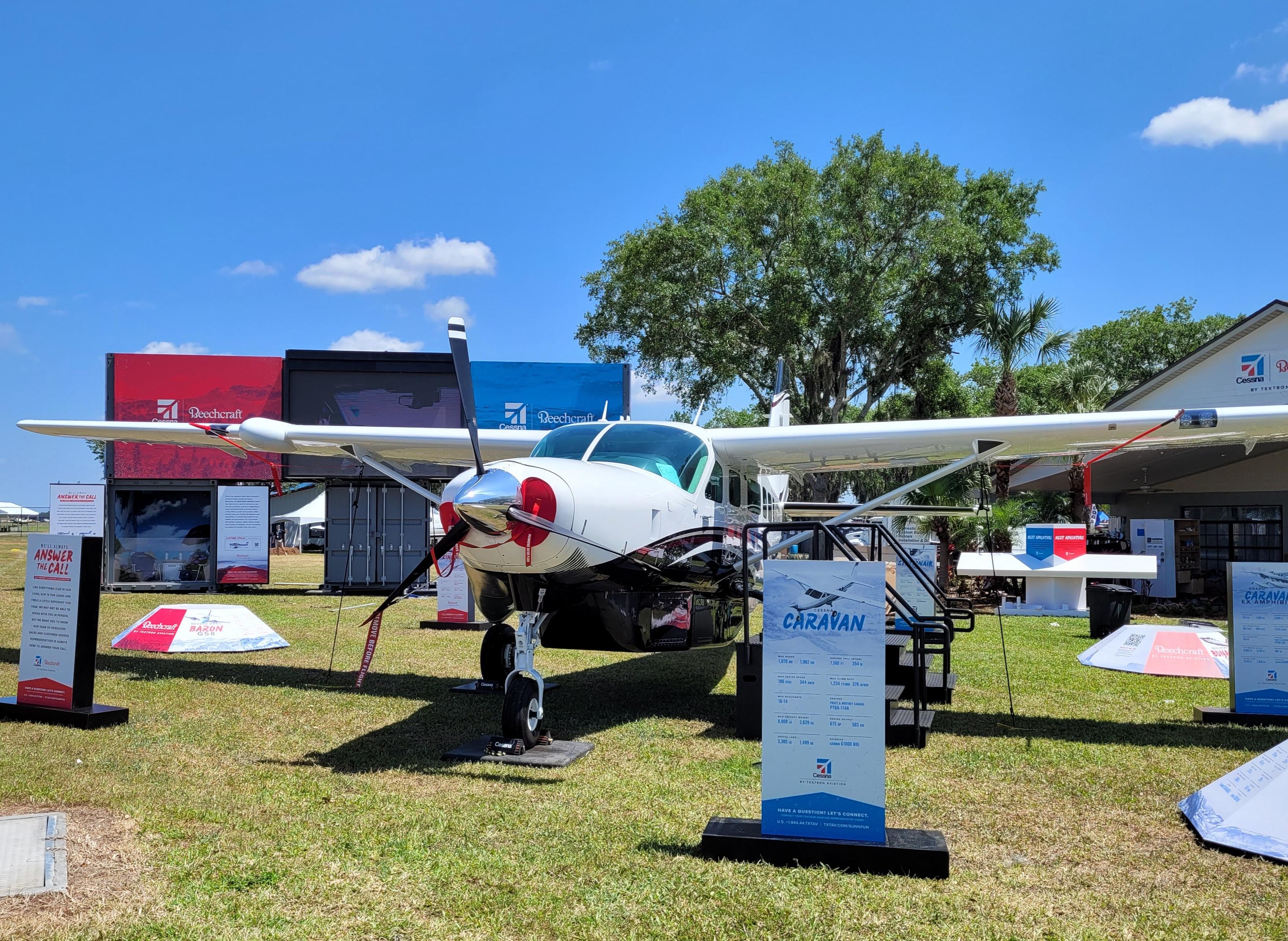 Sun ‘n Fun’s return in 2021 has attracted nearly 400 exhibitors to Lakeland, Florida, for the week of April 13-18. The number is down 20% from about 500 in 2019. While some exhibitors decided not to attend this year because of COVID, others are back in full swing, while a few moved forward with unmanned displays. Sun ‘n Fun was canceled in 2020 because of the pandemic. Textron Aviation is showcasing its Cessna Caravan on site for customers to touch and see. It also is featuring virtual aircraft displays where attendees scan a QR code to view the aircraft’s exterior and interior. Credit: Molly McMillin