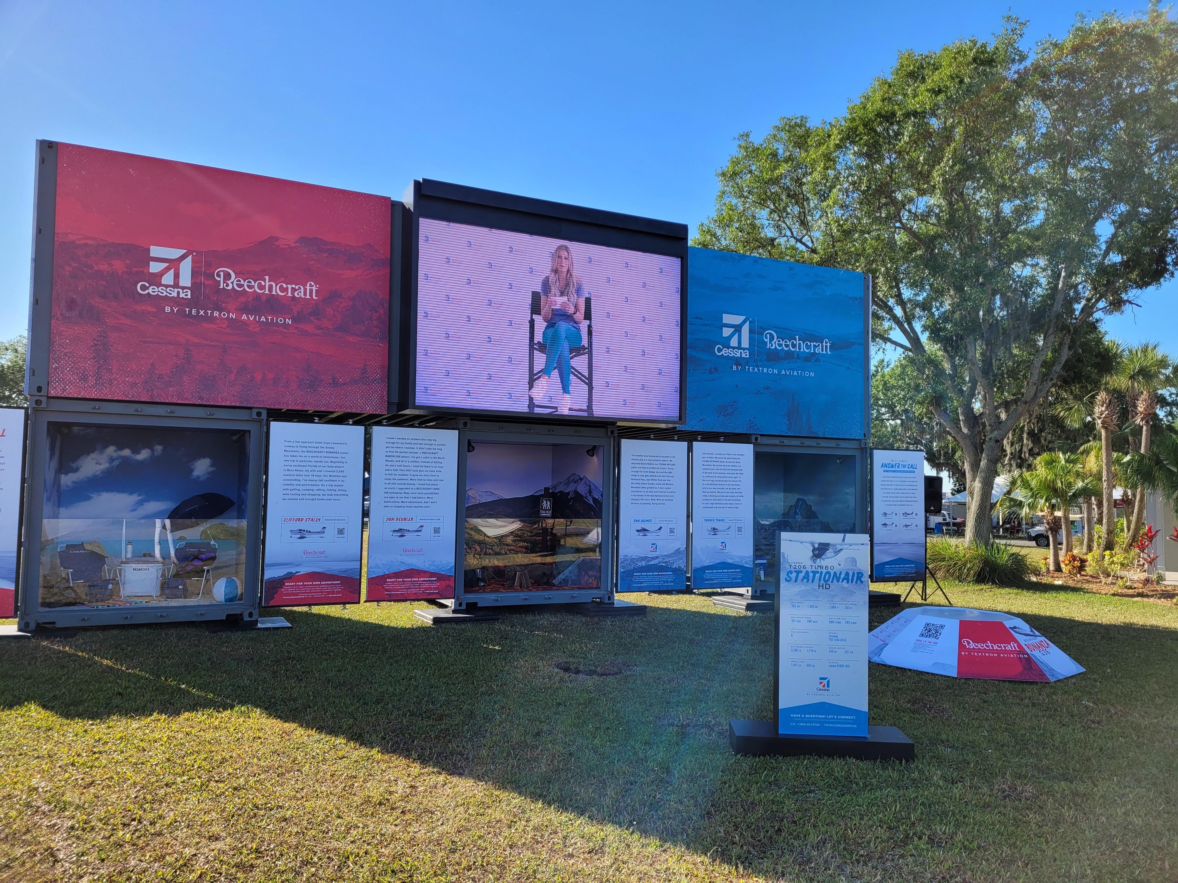 Textron Aviation's exhibit includes shadow boxes that tell stories about customers who have used their aircraft to go camping, to fly to the lake or to travel to the beach. The panels tell a story about how they had the opportunity to use their aircraft. Credit: Molly McMillin