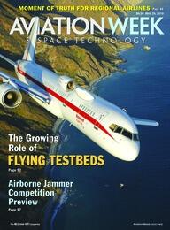Honeywell’s Boeing 757 testbed is used to evaluate an HTF7000 engine on a special fuselage-mounted strut attachment as it banks over Catalina Island, Calif. Engine manufacturers are stepping up investment in flying testbeds despite the availability of sophisticated ground test facilities (see p. 52)...