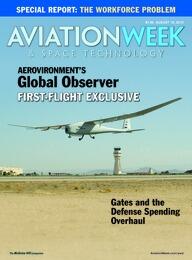 AeroVironment’s Global Observer high-altitude, long-endurance unmanned aircraft makes its first flight from Edwards AFB, Calif., on Aug. 5. The 175 ft.-span aircraft reached almost 4,000 ft. on the hour-long, battery-powered flight. Eventually, the Global Observer is planned to fly for seven days at...