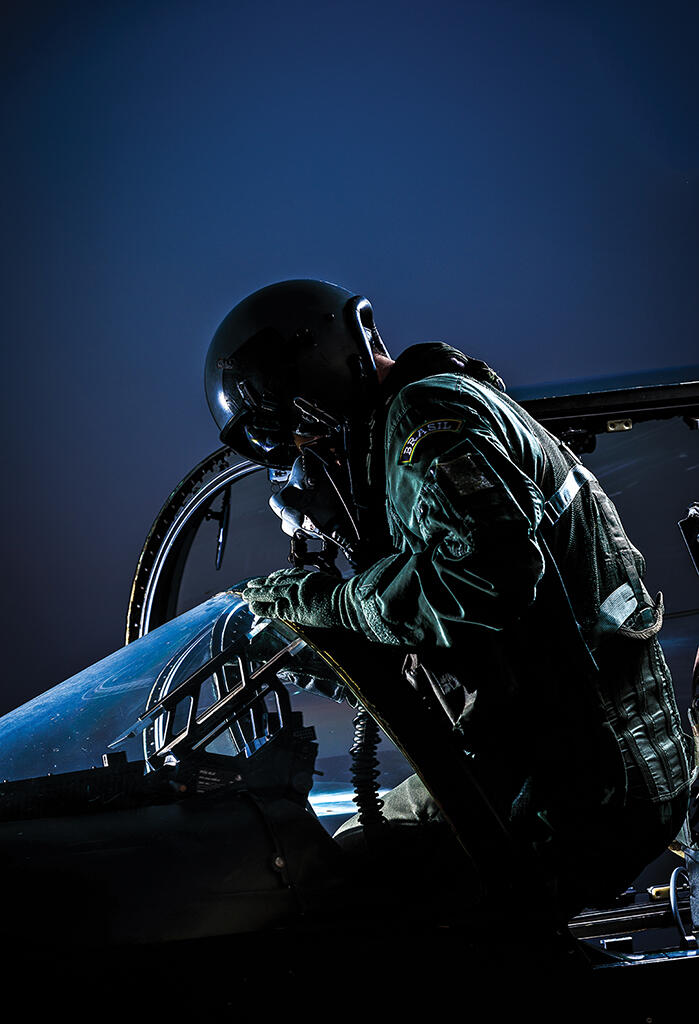A fighter pilot gets into his Embraer A-29 Super Tucano for another night mission at Campo Grande, Brazil.