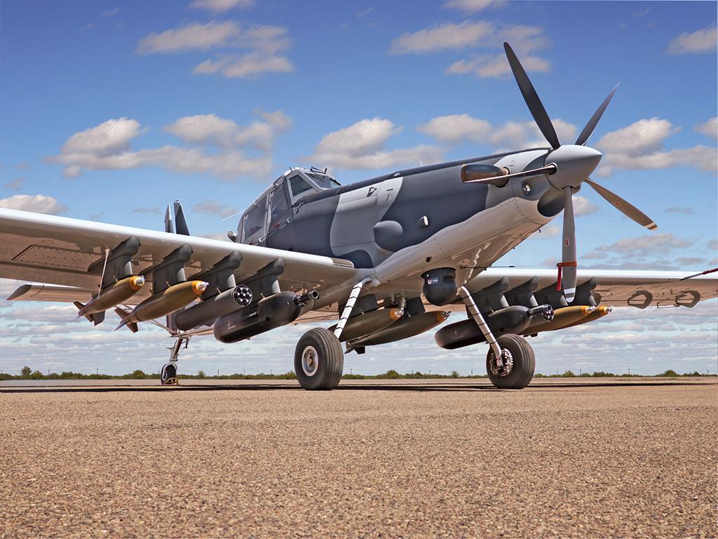 Still looking for a customer, Textron’s AT-6 Wolverine is an armed-ISR derivative of Beechcraft’s otherwise successful T-6 Texan II turboprop trainer, some 80 armed versions of which were supplied to Greece and Mexico. The aircraft has an uprated PT6A turboprop and Lockheed Martin’s mission computer from the A-10C, and it can carry an L3 Wescam MX-15HD EO/IR sensor on the fuselage centerline.