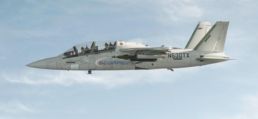 Textron has brought jet power to the light-attack/ISR market with the Scorpion, powered by two Honeywell TFE731-40R turbofans. Weighing 22,000 lb., the aircraft can carry 3,000 lb. of sensors internally or 6,200 lb. of stores externally. Four company-funded prototypes have flown.