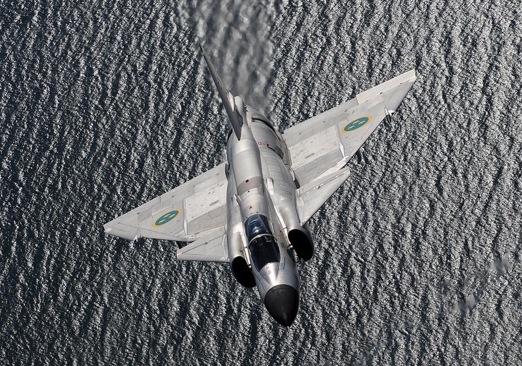 Swedish Air Force historic flight, Saab AJS 35 Draken fighter flies over the water near Satenas.