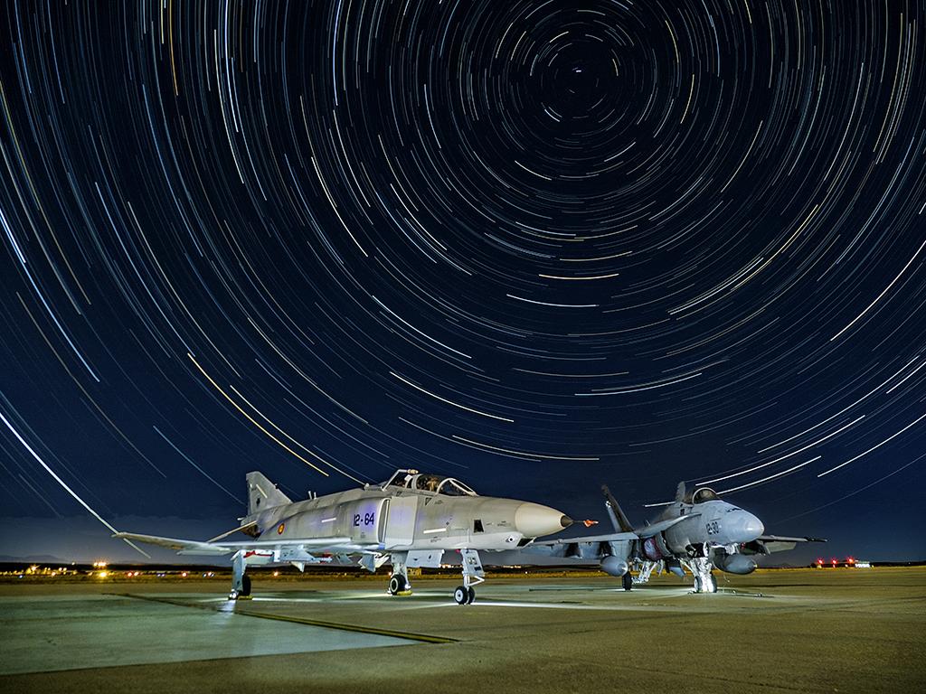 Old friends resting under the sky of the Torrejon Air Base, Spain. The photographer combined astrophotography with a special technique to capture this unique shot.