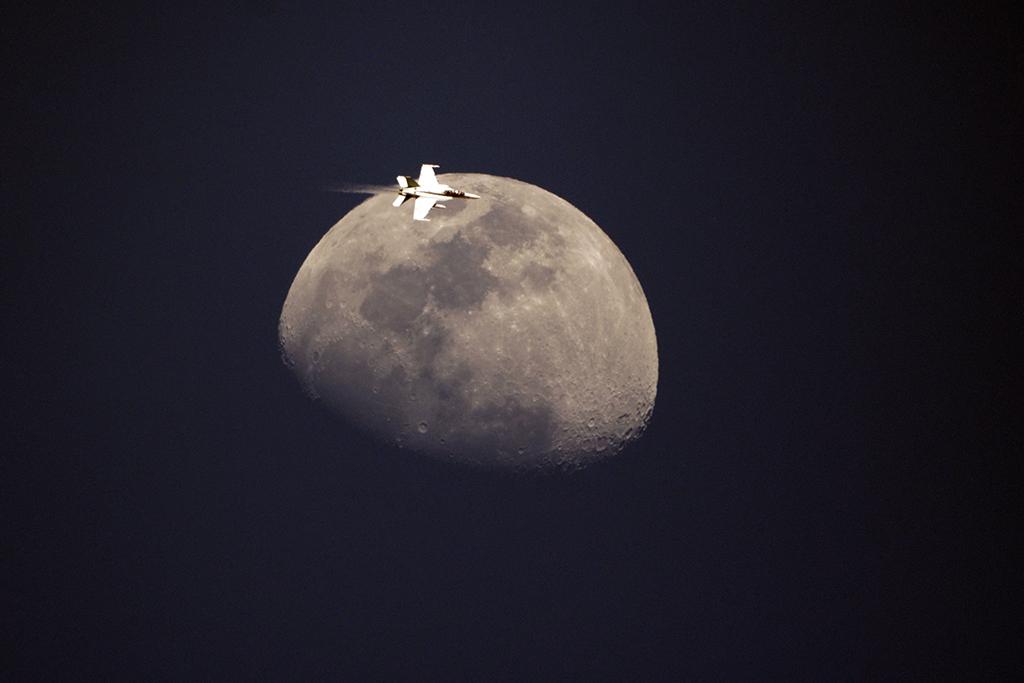 An F/A-18F Super Hornet flies in California's Death Valley with the Moon in the background.