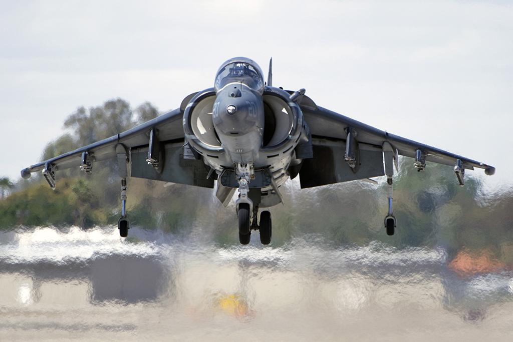 An AV-8B Harrier II displays its vertical flight capabilities.