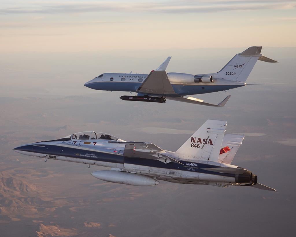 NASA's C-20A with Generation Orbit's hypersonic testbed attached is flown by NASA test pilots Tim Williams and Troy Asher. NASA F-18 No. 846, flown by test pilot Jim Less and videographer Lori Losey, is flying chase. The image was captured by Jim Ross from a NASA F-15 flown by chief test pilot Nils Larson on Dec. 11, 2017.