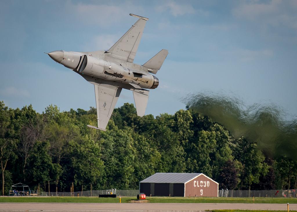 An F-16 demonstration pilot makes an initial turnout after takeoff at Air Venture 2018 in Oshkosh, Wisconsin.