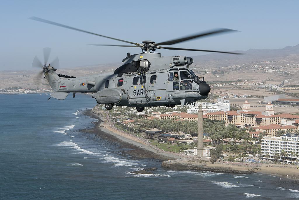 The "Faro de Maspalomas" lighthouse at Gran Canaria, home base of the Spanish Air Force 802 Sqdn., which has a search-and-rescue mission, provides a special backdrop for one of the unit's Airbus AS 332B1 helicopters.