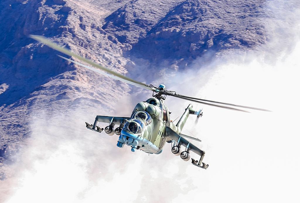 A former Bulgarian Air Force Mi-24D Hind rises through a self-made dust storm at Nellis AFB, Nevada.