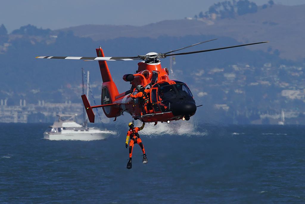On Oct. 5, 2018, a U.S. Coast Guard HH-65 performs a search-and-rescue demonstration at San Francisco's Fleet Week Air Show.