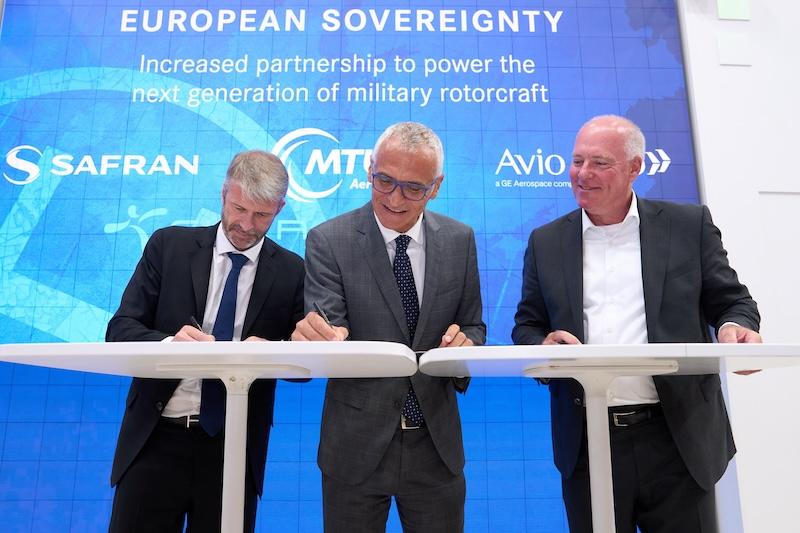From left, Cédric Goubet, CEO of Safran Helicopter Engines, Riccardo Procacci, CEO of Avio Aero, and Michael Schreyögg, Chief Program Officer of MTU Aero Engines.