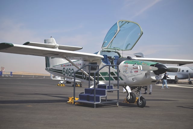 The PAC MFI-17 Super Mushshak was parked on the static display showing it fitted with new Dynon avionics displays, the same system being integrated into the Royal Saudi Air Force (RSAF) examples.