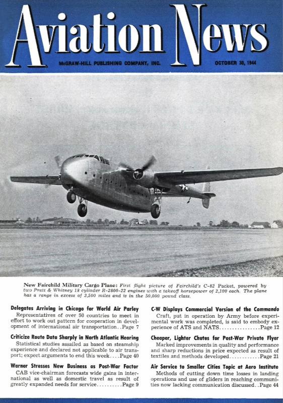 Aviation News, as our publication used to be known, showcased the Fairchild Military Cargo Plane on the cover of the October 30, 1944 issue, during its first flight. The Fairchild C-82 Packet was powered by two Pratt & Whitney 18-cylinder R-2800-22 engines with a takeoff horsepower of 2,100 each. The plane had a range in excess of 3,500 miles and is in the 50,000 pound class.