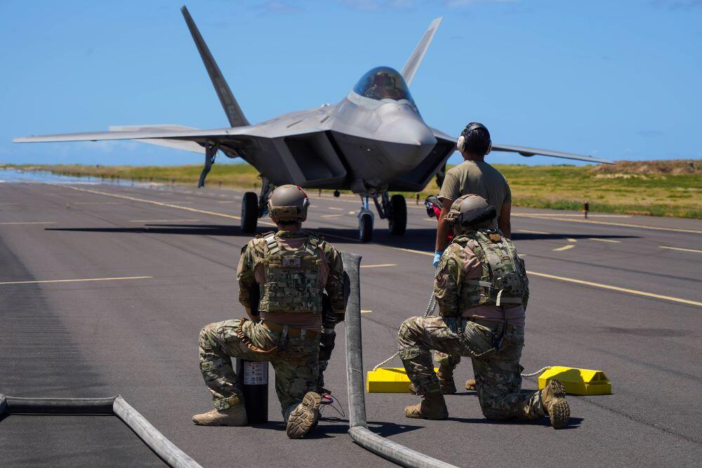 An F-22 lands at a small airstrip in Hawaii as part of a 2021 exercise.