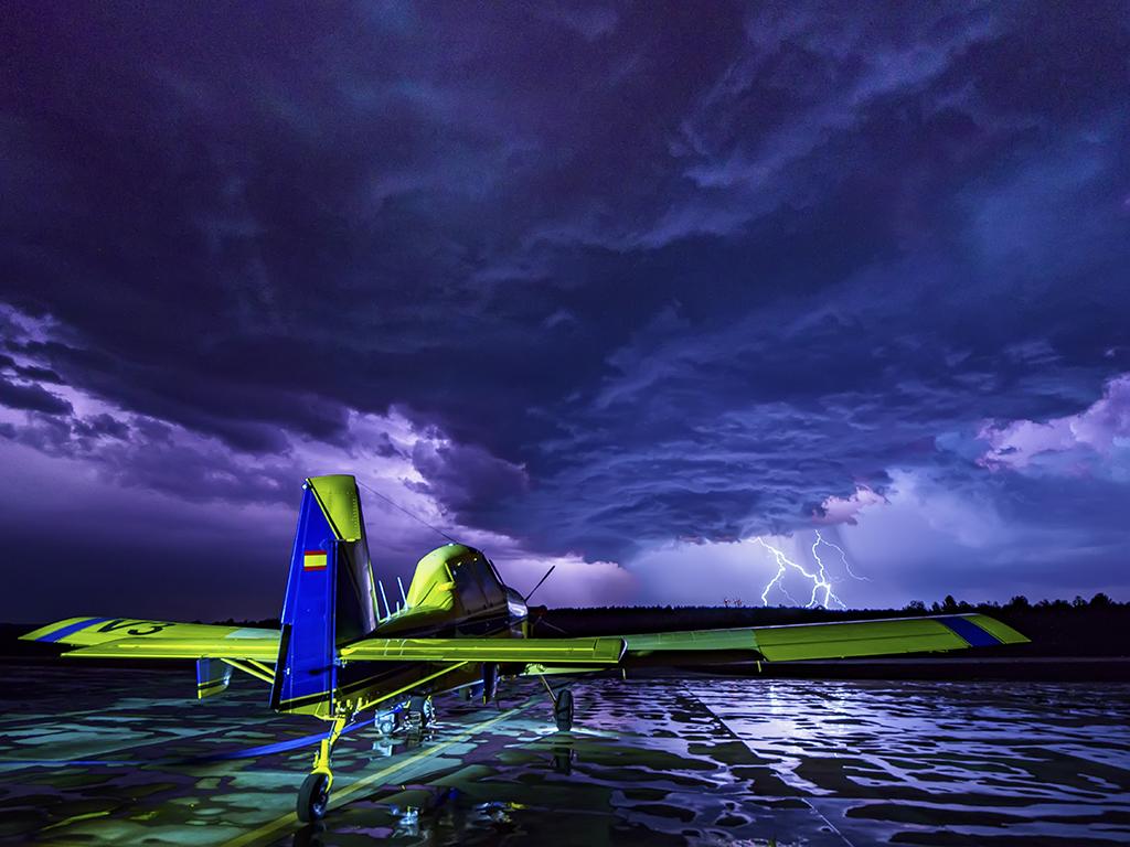 A night of thunder and lightning surrounds a firefighting aircraft in the Spanish city of Cuenca in the Castile region.