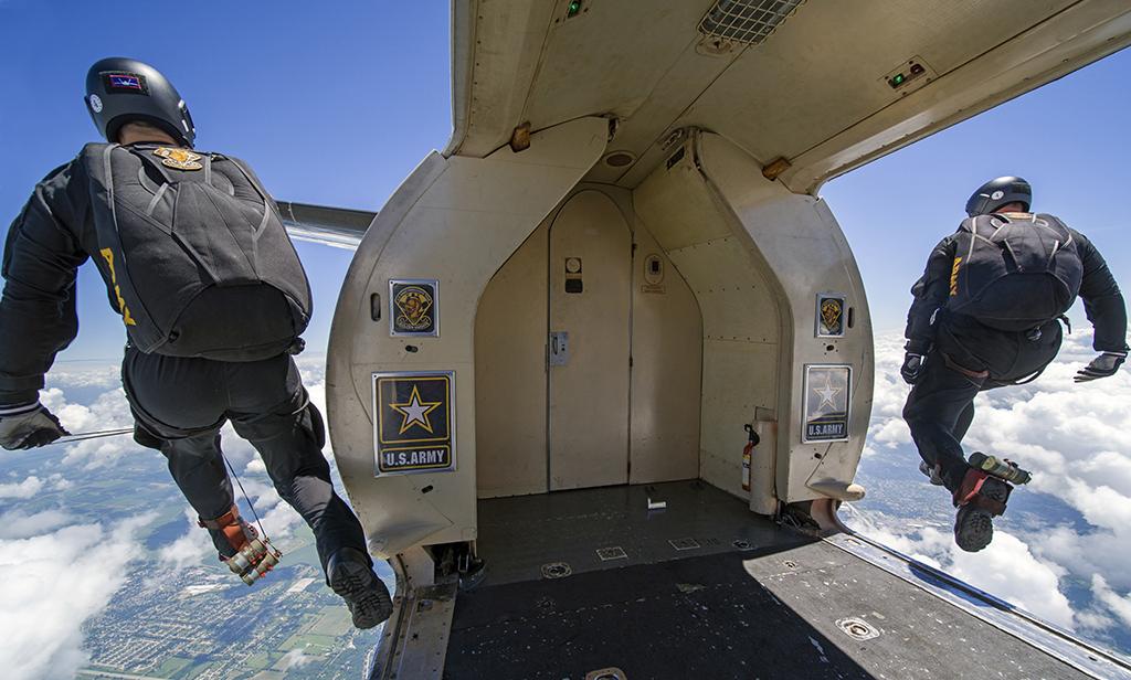 Two members of the U.S. Army Golden Knights exit their C-31A aircraft at 12,500 ft. over Dayton, Ohio during the 2018 Vectren Dayton Air Show.