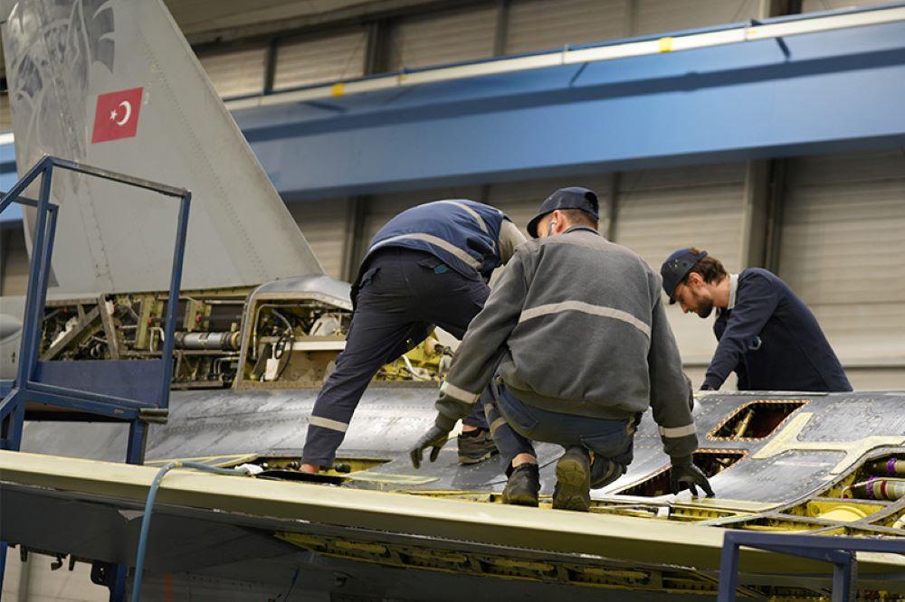 Technicians work on an F-16 at an MRO facility in Eskişehir, Turkey.