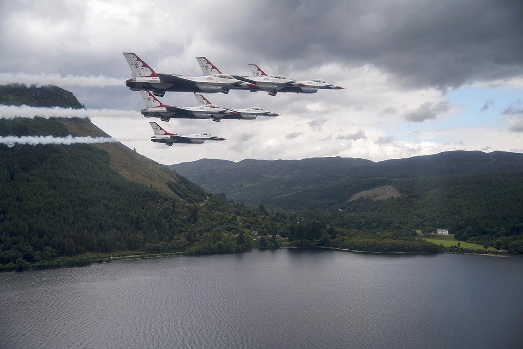 To prepare for their first performance in 10 years at the world's largest military air show, the Royal International Air Tattoo (RIAT) held here, the Air Force's premier aerobatic team flew all over Great Britain July 10, flying over several bases, including RAF Lakenheath, as well as landmarks such as Stonehenge and Loch Ness, Scotland, Krajicek said.