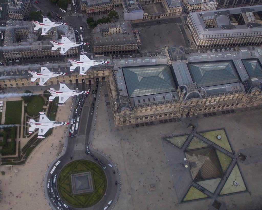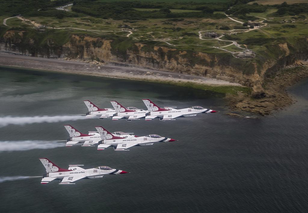 Then it was on to France for a practice procession ahead of Bastille Day celebrations. The team flew over famous Paris landmarks, including the Eiffel Tower, the Louvre and Charles de Gaulle Airport as well as the French countryside. The Thunderbirds also flew over several sites in Normandy, France, to honor the U.S.-French alliance in World War II.