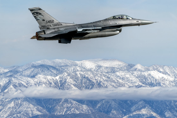 An F-16 from the South Dakota National Guard takes off with afterburner from March Air Reserve Base in Riverside, California, against the snow covered mountains.