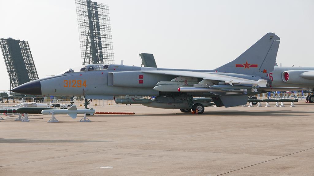The Xian JH-7A bomber is not the most modern platform in the world but was displayed at the November 2014 Zhuhai air show with a new targeting pod and an array of guided weapons. Behind it towers the antenna of the JY-27A Skywatch-V radar, a counter-stealth system operating in the VHF band and using active, electronically scanned array (AESA) technology.