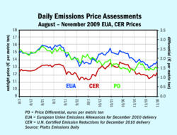 European Union emissions allowance (EUA) prices eased back in November on a lack of buy-side support amid uncertainty ahead of the Copenhagen climate summit and jitters over the strength of economic recovery in Europe. December 2010 EUAs became the front-year contract after most over-the-counter...