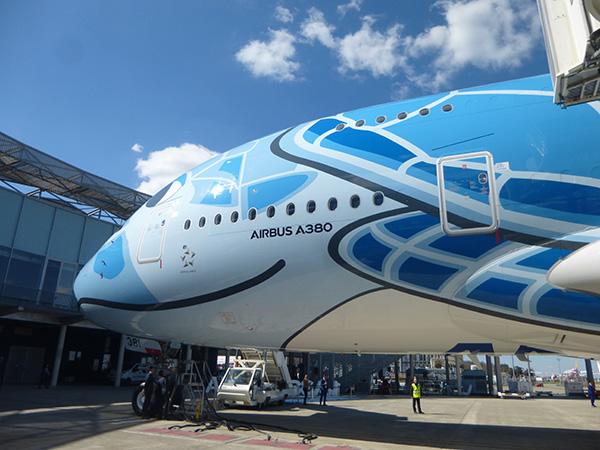 The livery of ANA’s A380 features the Honu, the Hawaiian green sea turtle. With this aircraft, Airbus said there are 232 A380s in service with 15 airlines.