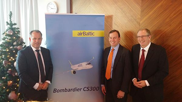AirBaltic CEO Martin Gauss, pictured with Bombardier executives Frank Cromer (L) and Robert Dewar (R)
