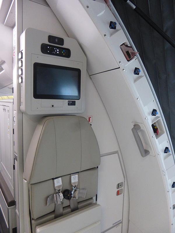 A crew seat next to Door 1 on the aircraft's left side. Above is a display to arrange cabin, light and announcement features.