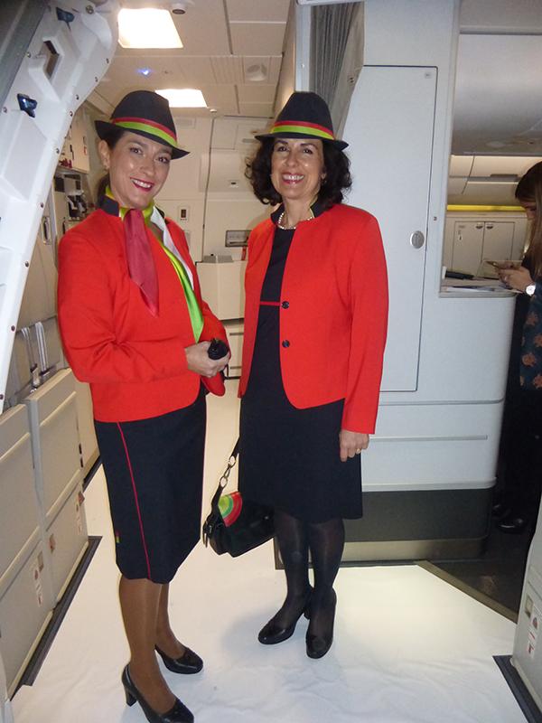 Two TAP flight attendants welcome ATW onboard the aircraft.