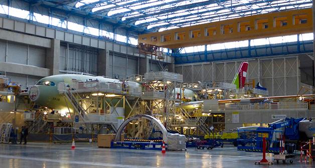 The A330neo in front of the Airbus delivery center.