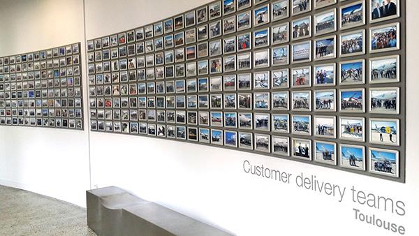 Photos of Airbus aircraft handovers in the lobby of the delivery center.
