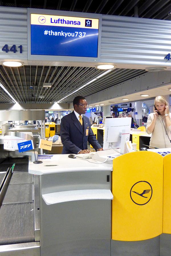 A dedicated check-in at Frankfurt Airport welcomes passengers for the Lufthansa 737 farewell flight.