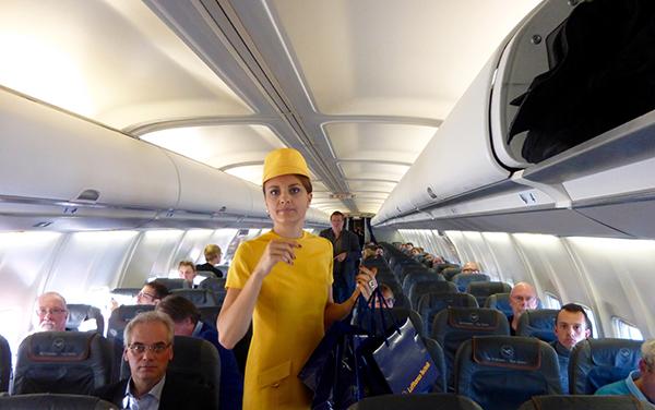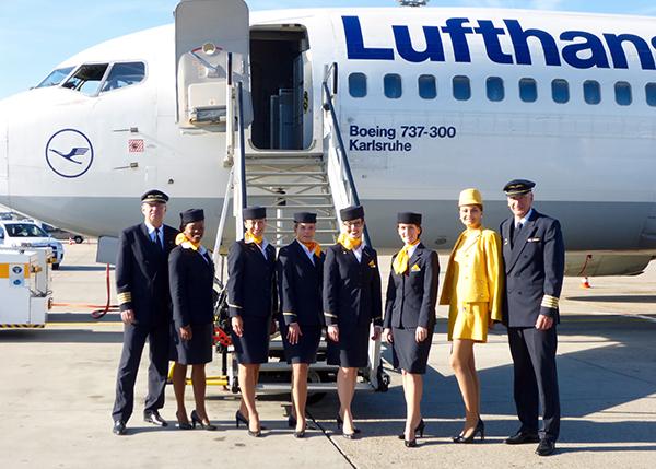 A Lufthansa flight attendant, dressed in a uniform from 1979, welcomed ATW on board.