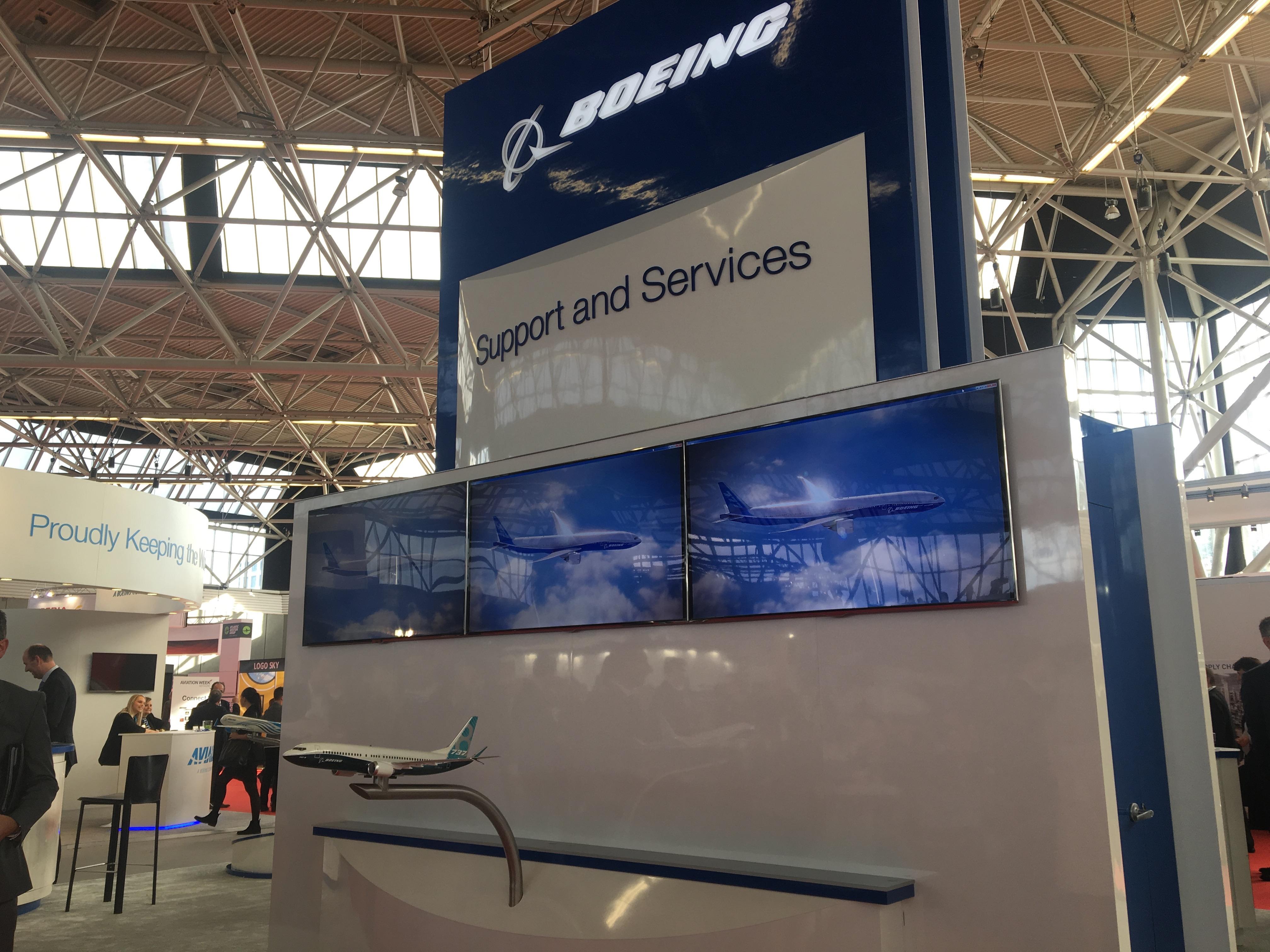 Boeing (Booth 12-325) has three screens of continuous reels of tablets and technology.