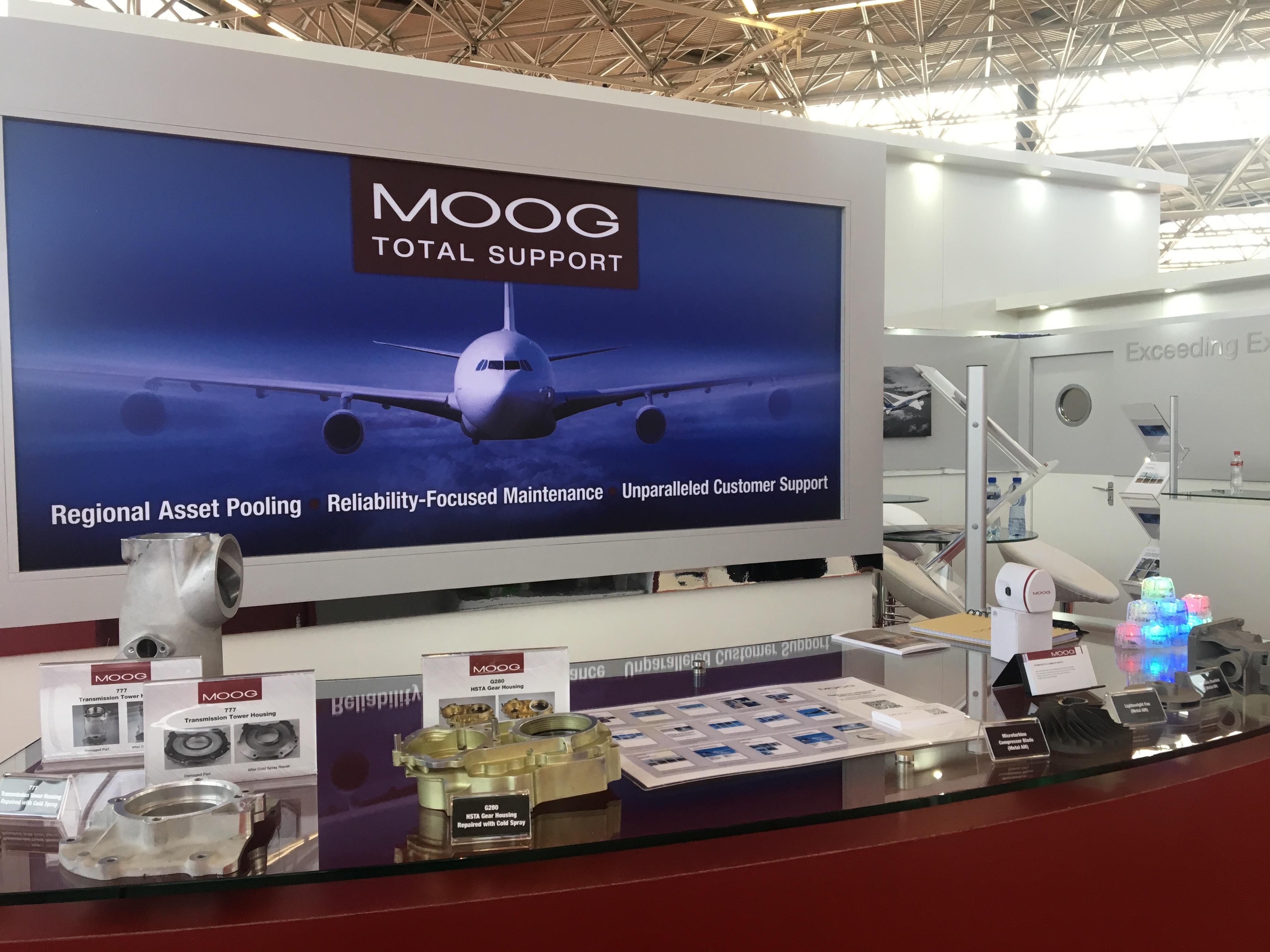 Moog (Booth 12-641) has light-up swag and repaired components on its table, including an HSTA Gear Housing repaired with cold spray and transmission tower housing, also repaired with cold spray.