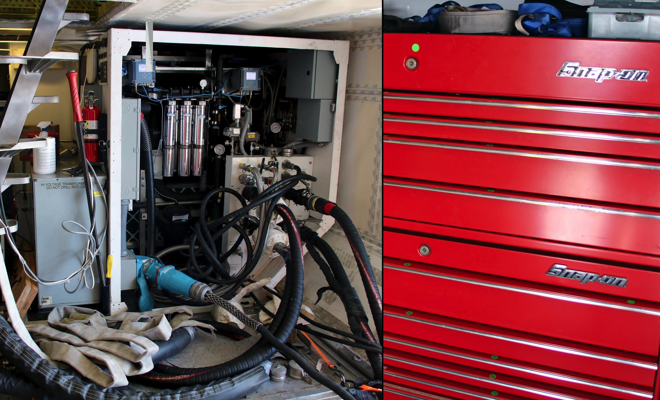 The cargo compartment is also equipped with toolboxes donated by Snap-on and special lightweight stairs that can be broken into three pieces and stored inside.