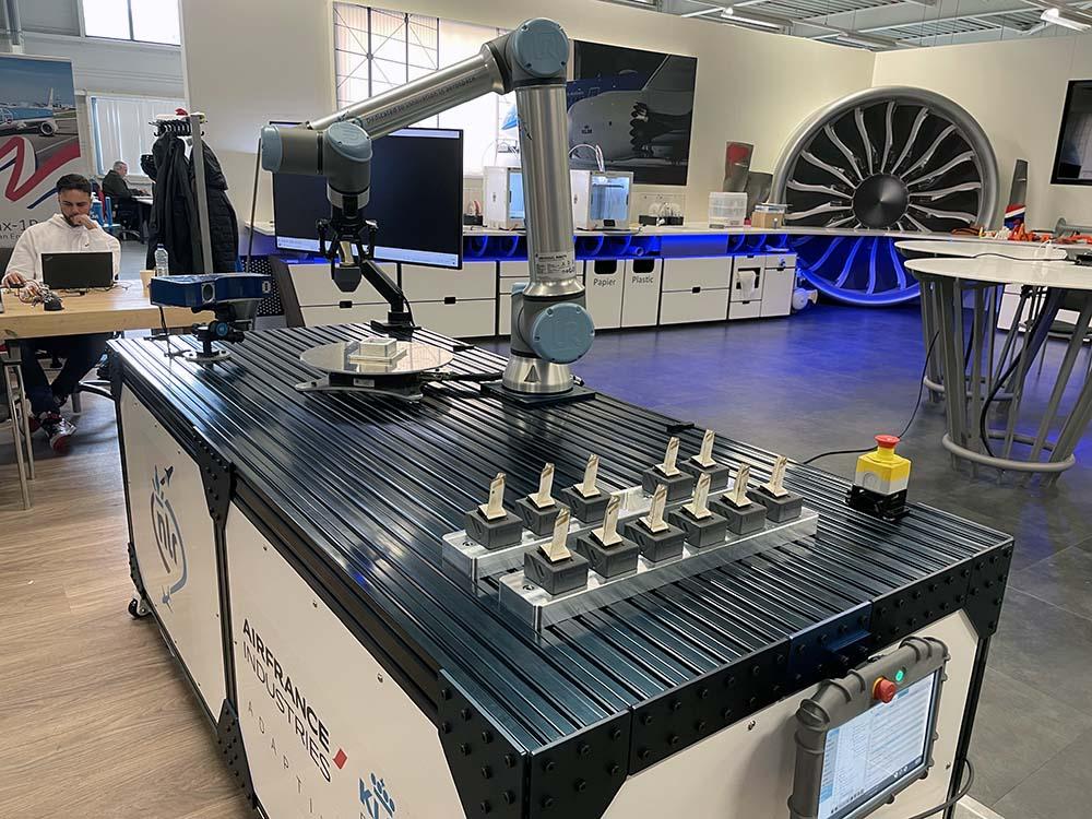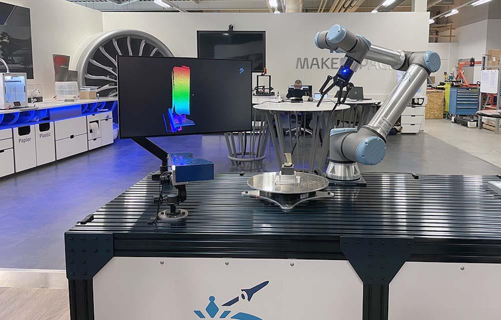 Under the Smart MRO focus area, KLM E&M is developing robotics for repair and inspection processes. The robot pictured here has been programmed to perform autonomous engine blade inspections, checking to see if holes are blocked or plugged. The robot picks up engine blades and sets them on a platform, which rotates so 360-deg., 3D images can be taken to give a full view of the part.