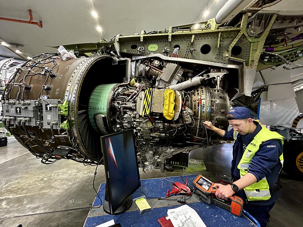 An airBaltic technician looks into an engine through a borescope. AirBaltic President and CEO Martin Gauss says engines are now spending around 3,500-4,000 hr. on wing.