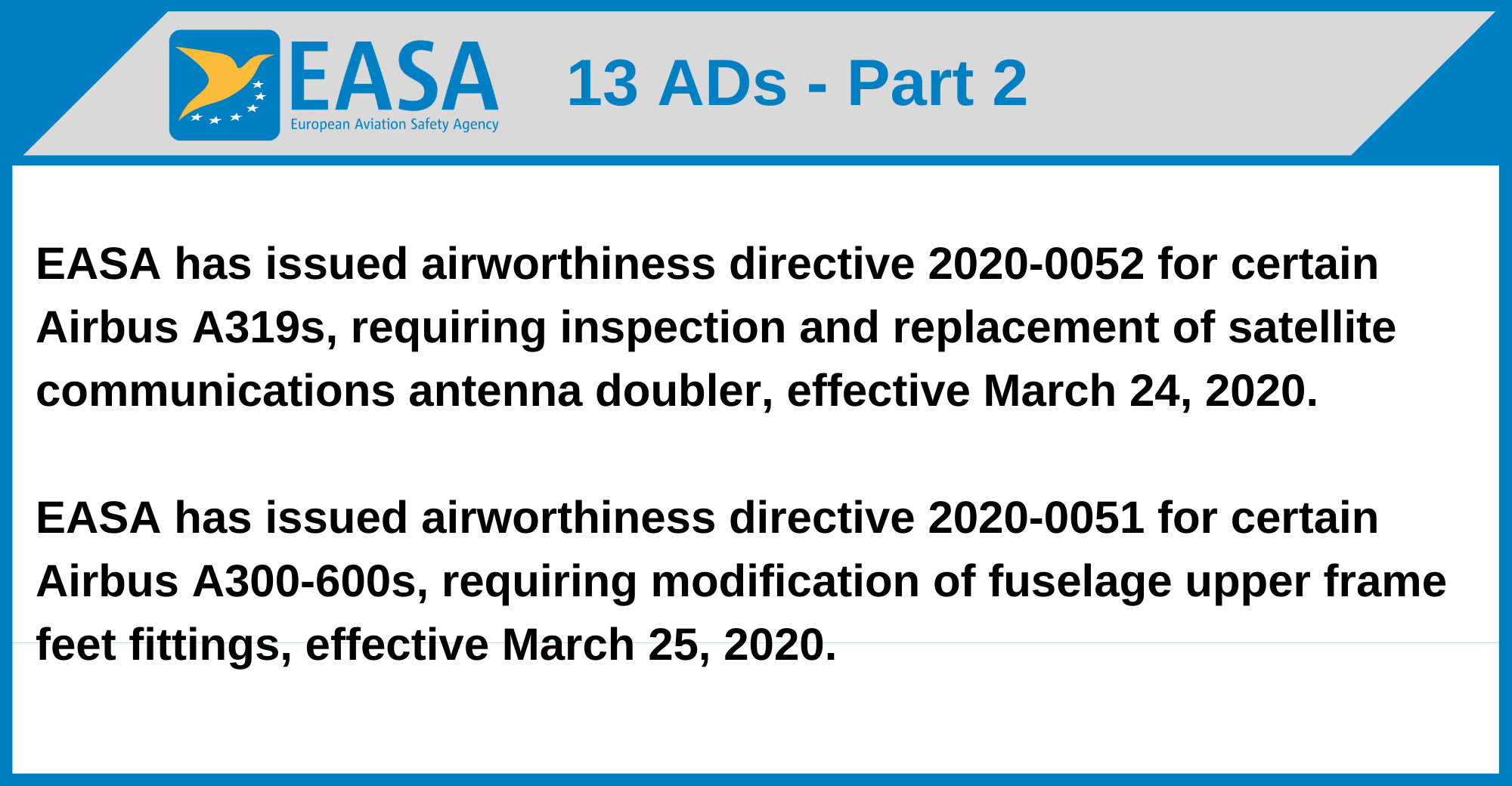 EASA has issued airworthiness directive 2020-0052 for certain Airbus A319s, requiring inspection and replacement of satellite communications antenna doubler, effective March 24, 2020.
