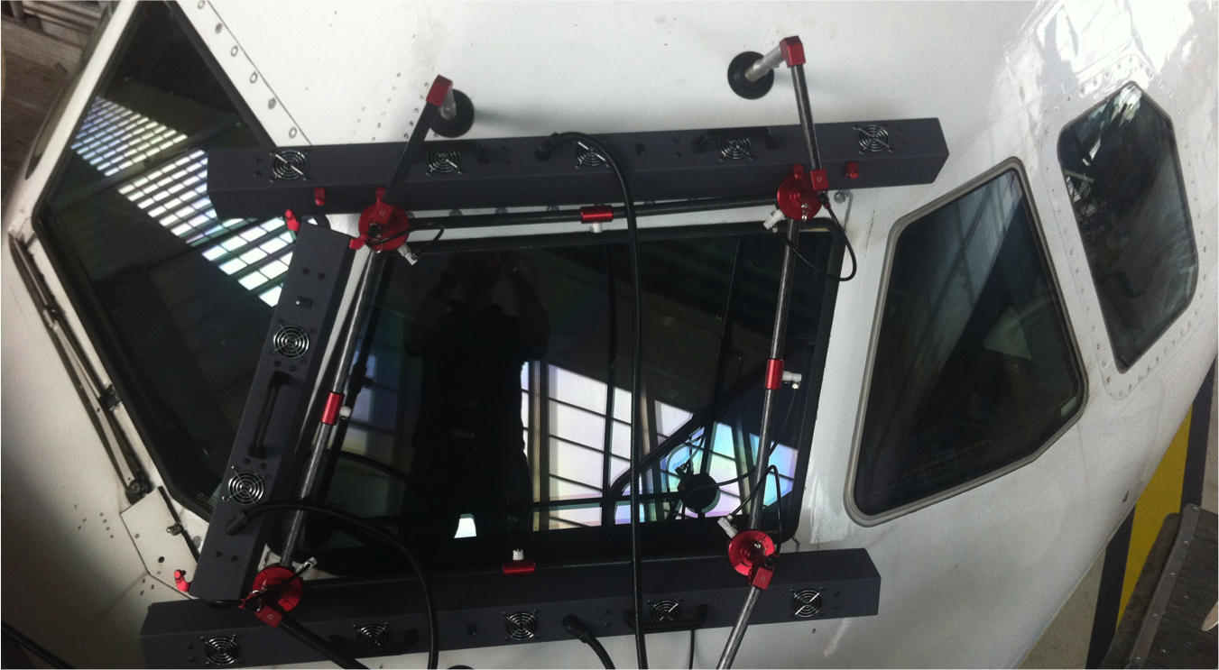To reduce time on windshield replacement during line maintenance Sunaero developed the Windshield Rapid Curing system, a solution based on an electric infrared emitter mounted on a light carbon-fiber frame to reduce the polymerization time. This technology enables sealant cure time in less than one hour.