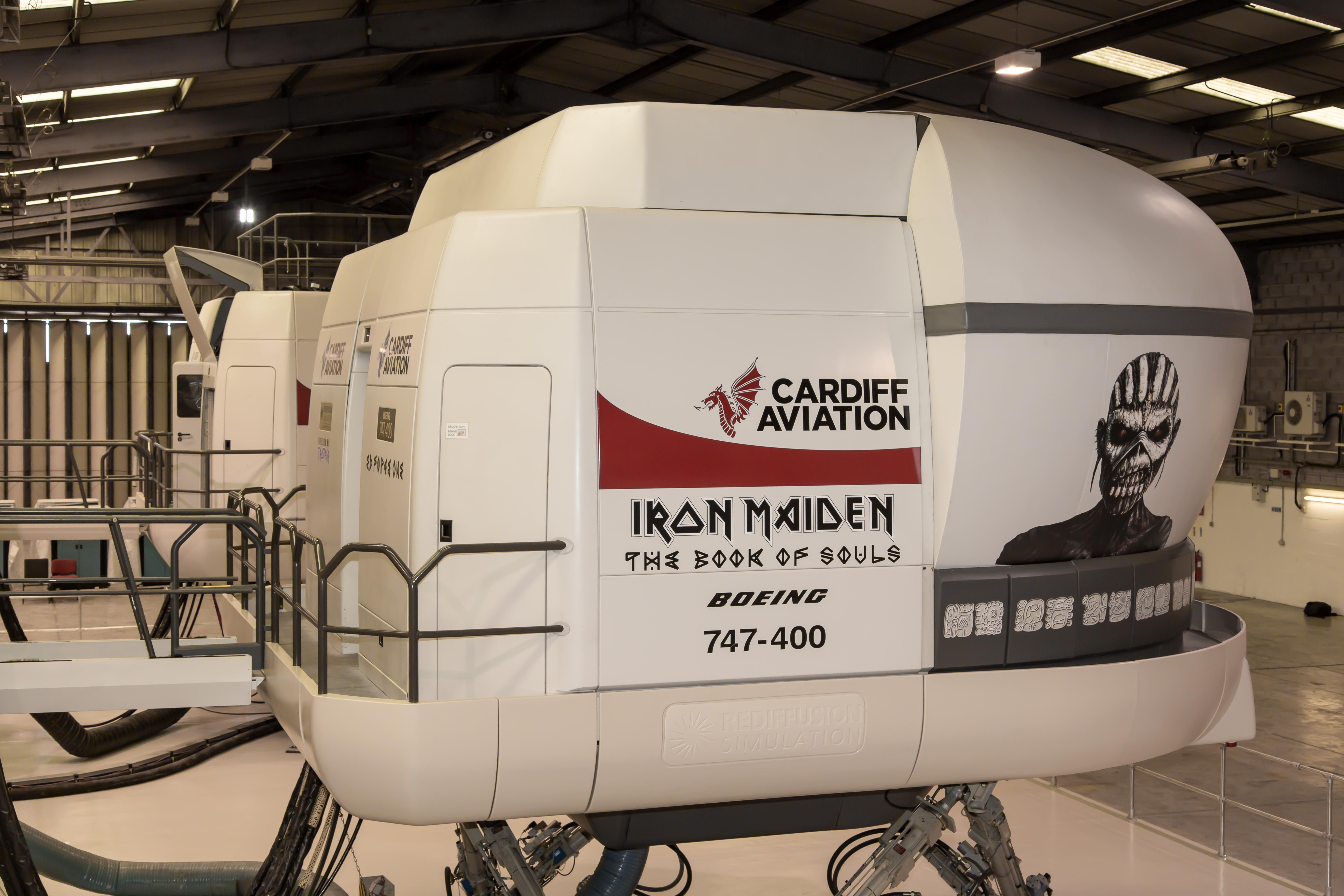 One of the 747-400 simulators, with promotional branding for Iron Maiden's new album, The Book of Souls.