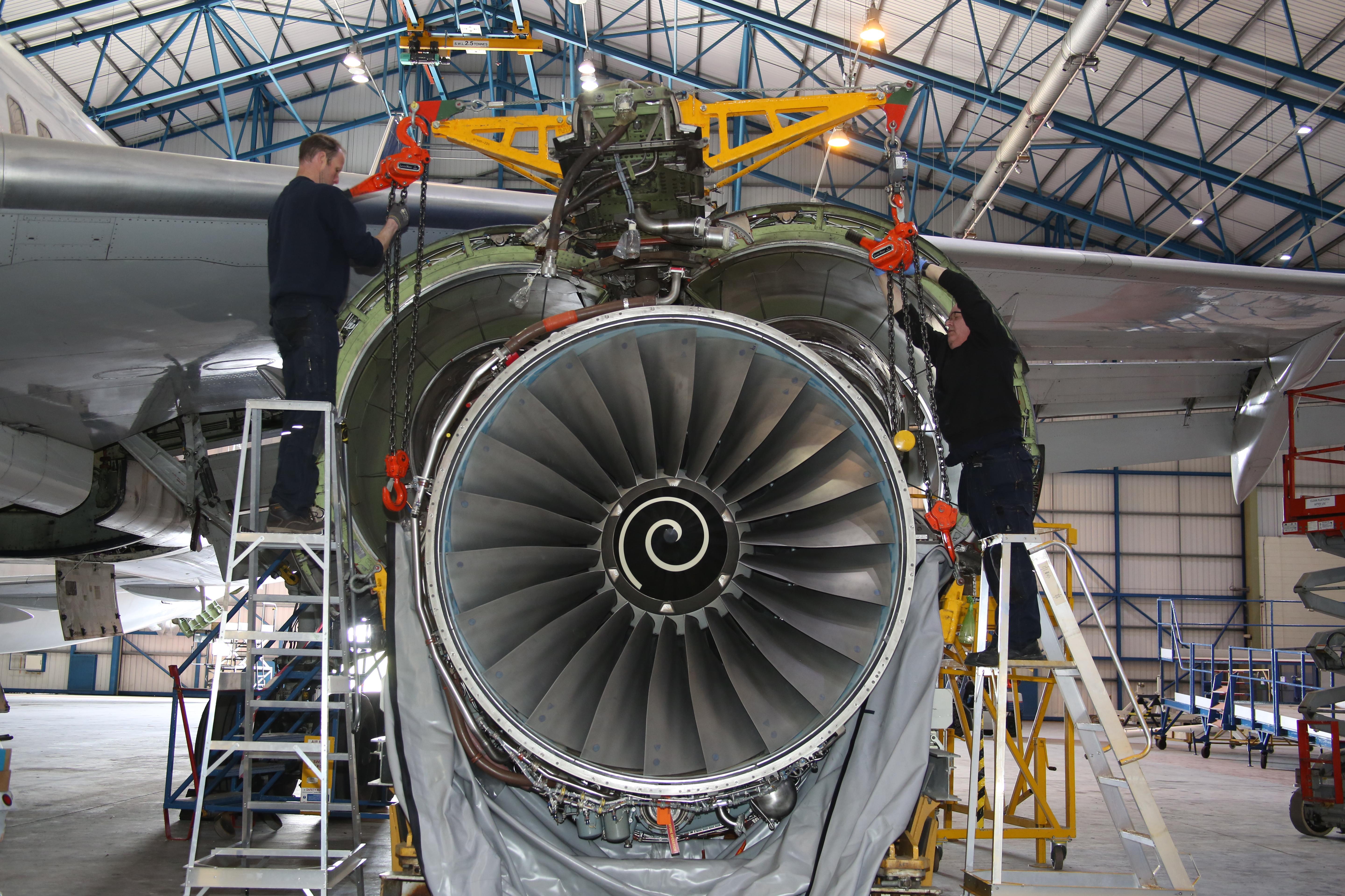 Engineers removing an engine at Cardiff Aviation’s maintenance, repair and overhaul (MRO) facility.