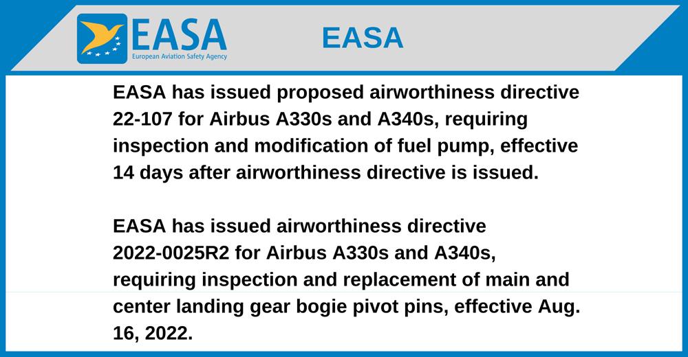EASA has issued proposed airworthiness directive 22-107 for Airbus A330s and A340s, requiring inspection and modification of fuel pump, effective 14 days after airworthiness directive is issued.