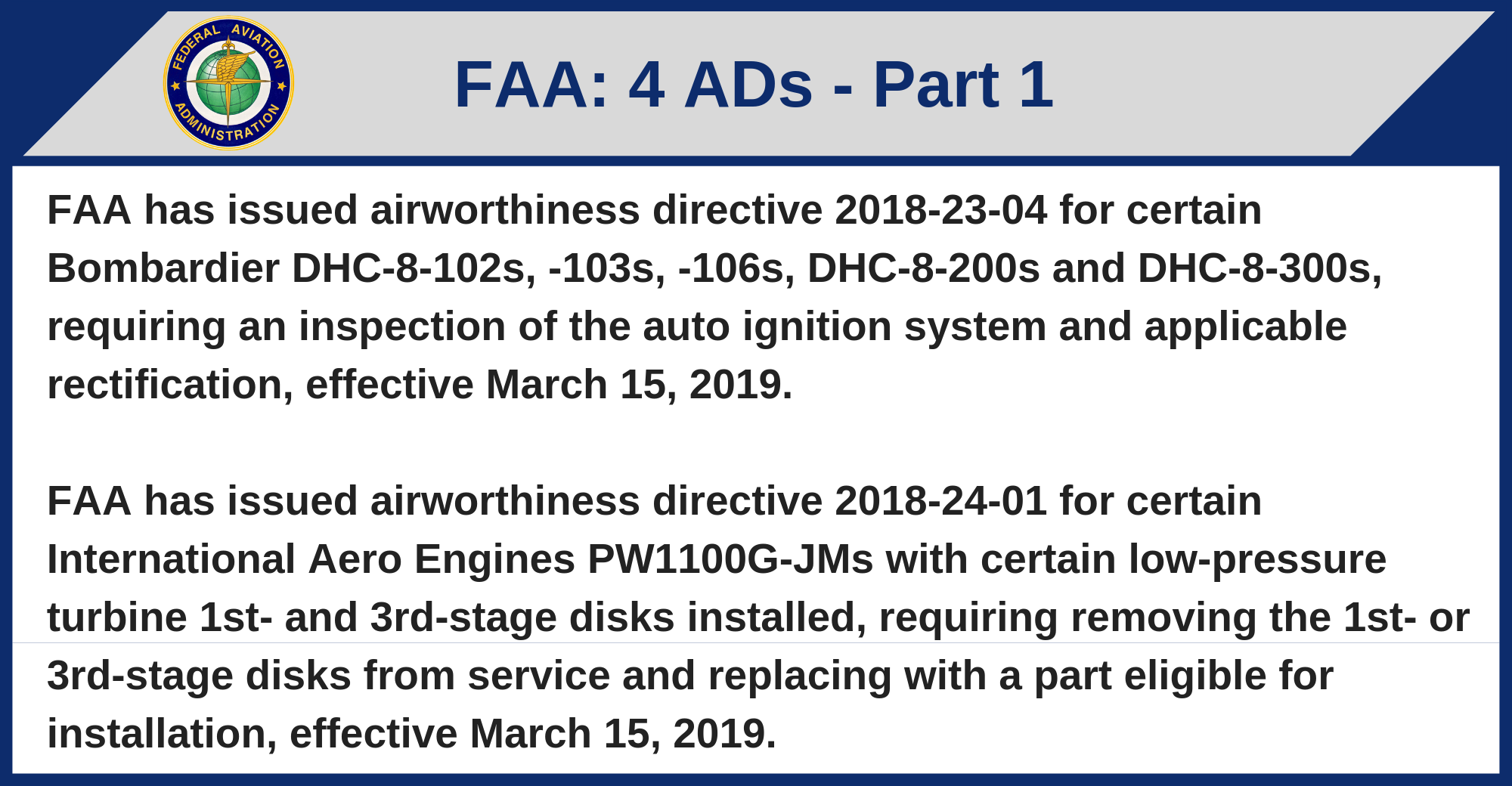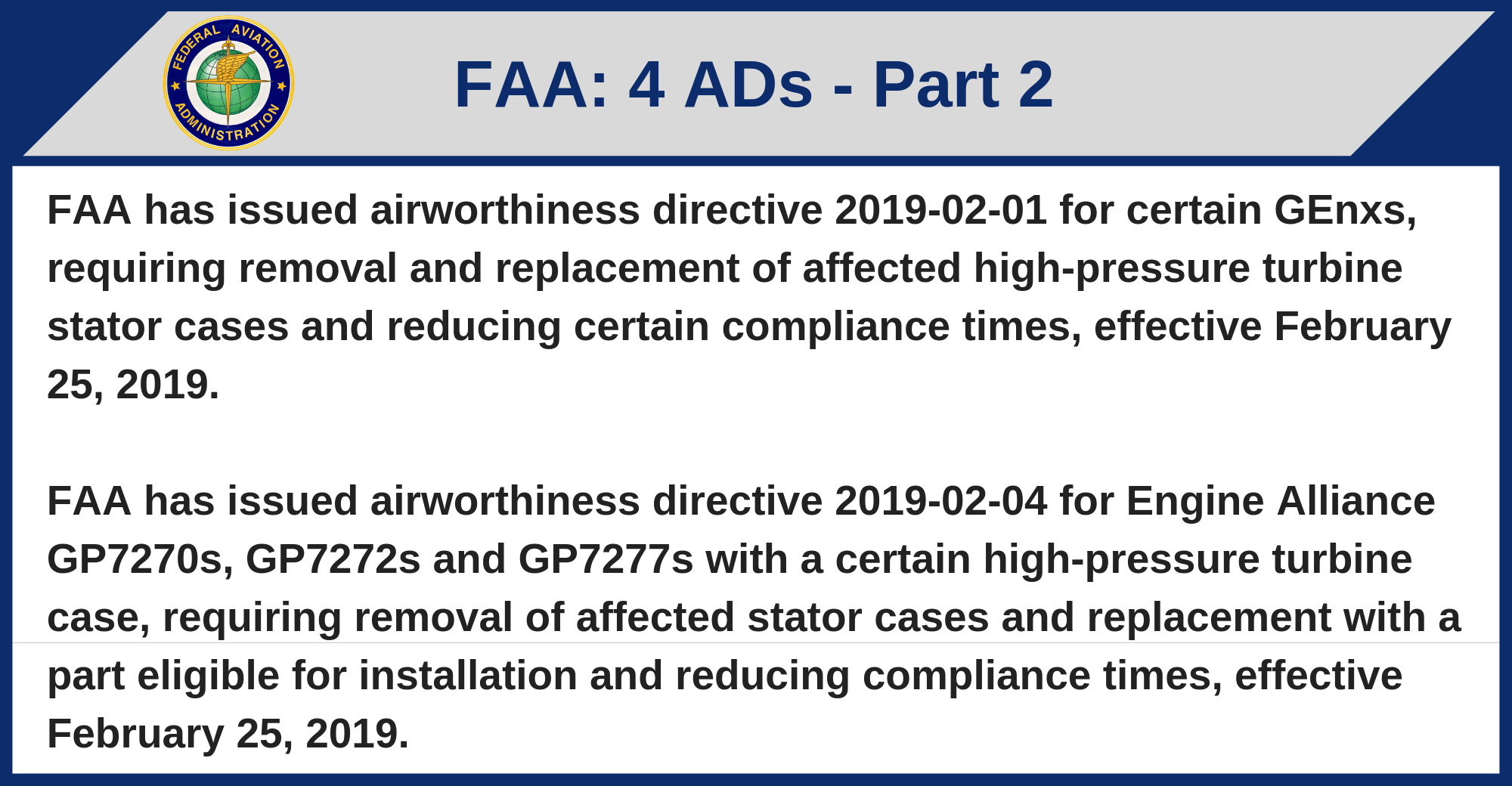 FAA has issued airworthiness directive 2019-02-04 for Engine Alliance GP7270s, GP7272s and GP7277s with a certain high-pressure turbine case, requiring removal of affected stator cases and replacement with a part eligible for installation and reducing compliance times, effective February 25, 2019.
